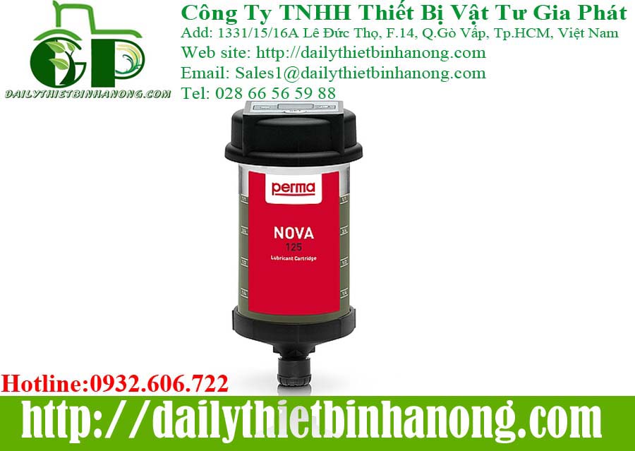 Perma NOVA có thể được sử dụng trong mọi lĩnh vực ứng dụng từ -20 °C đến +60 °C. Có thể nhập khoảng thời gian xả từ 1 đến 12 tháng thông qua nút cài đặt trên thiết bị Điều khiển NOVA. Sau đó, bộ điều khiển sẽ tính toán lượng khí cần thiết để xả liên tục và đáng tin cậy trong khi có tính đến nhiệt độ môi trường. perma NOVA bao gồm một bộ điều khiển có thể tái sử dụng, một LC NOVA chứa đầy mỡ hoặc dầu và một nắp bảo vệ. NOVA LC có sẵn trong 65 cm³ và 125 cm³.